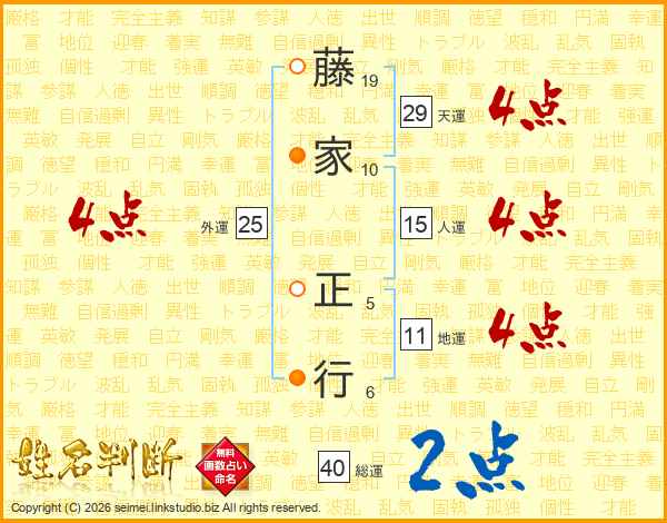 家系が持つ宿命的な運勢を表します。祖先から受け継いだ苗字ですので自分の力が及びません。家柄を象徴します。苗字の合計画数。