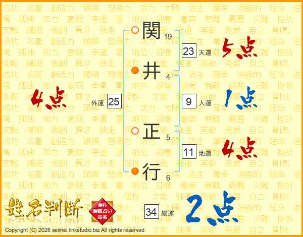あなたの人生を表す1番重要な運勢です。生涯を通じて影響する総合運となり、主に50歳以降の晩年期に影響を及ぼします。苗字と名前の合計画数。