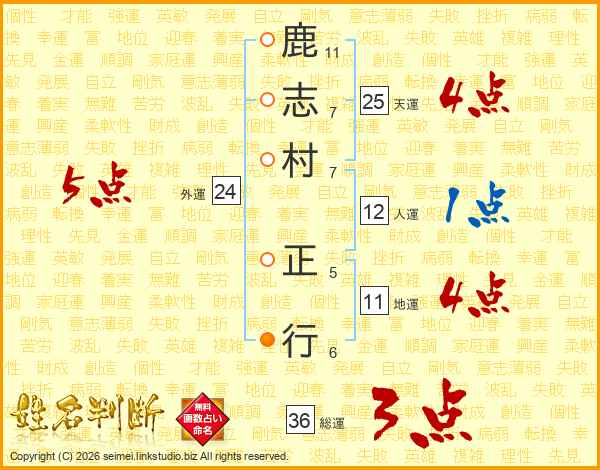 鹿(11画)志(7画)村(7画) 正(5画)行(6画)