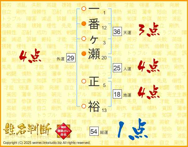 一番ヶ瀬正裕さんの人運は25画の4点!