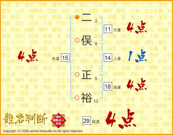 生活面を象徴する運勢です。外部から受ける影響力を表し、結婚運、家庭運や職場、環境への順応性を表します。総運から人運を引いた画数。姓や名が1文字の場合を除く。