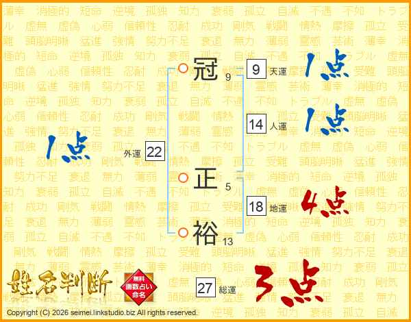 冠(9画) 正(5画)裕(13画)