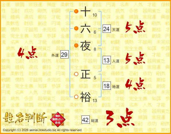 あなたの人生を表す1番重要な運勢です。生涯を通じて影響する総合運となり、主に50歳以降の晩年期に影響を及ぼします。苗字と名前の合計画数。