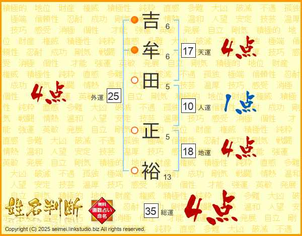 吉(6画)牟(6画)田(5画) 正(5画)裕(13画)