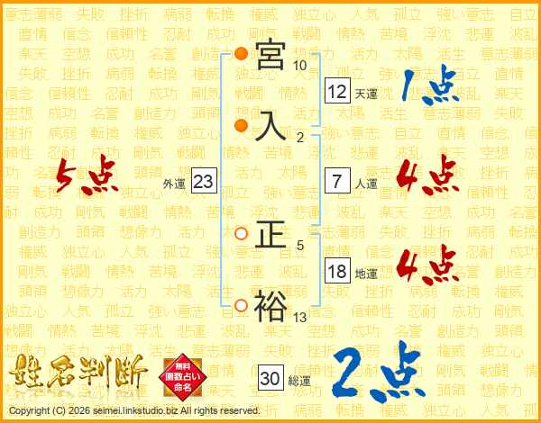 宮(10画)入(2画) 正(5画)裕(13画)