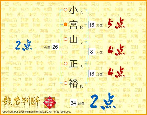 小(3画)宮(10画)山(3画) 正(5画)裕(13画)