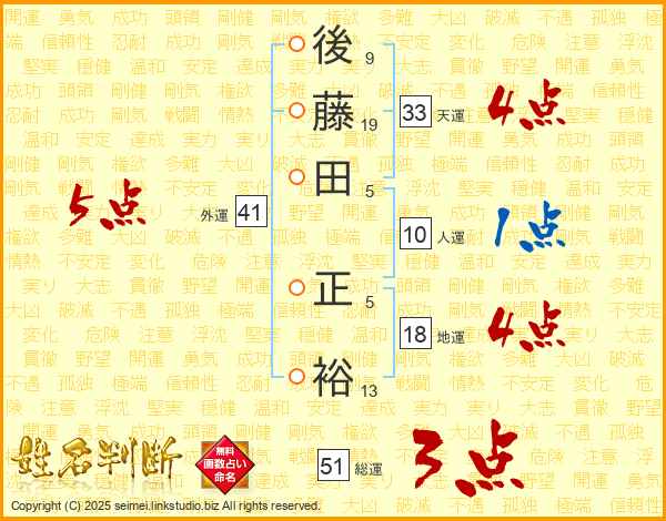 後(9画)藤(19画)田(5画) 正(5画)裕(13画)