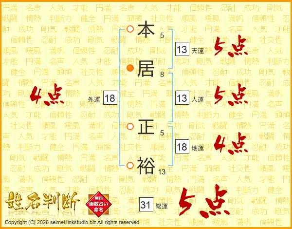 あなたの人生を表す1番重要な運勢です。生涯を通じて影響する総合運となり、主に50歳以降の晩年期に影響を及ぼします。苗字と名前の合計画数。