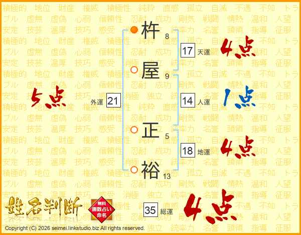杵(8画)屋(9画) 正(5画)裕(13画)