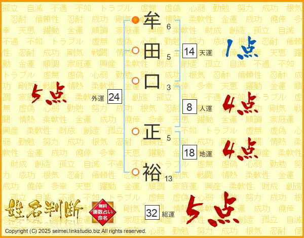 牟(6画)田(5画)口(3画) 正(5画)裕(13画)