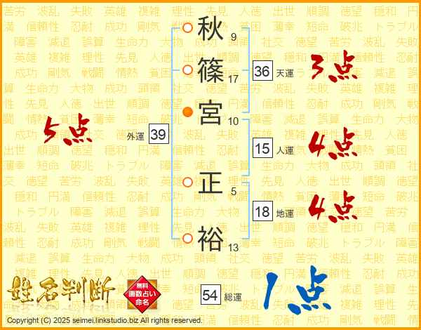 秋(9画)篠(17画)宮(10画) 正(5画)裕(13画)