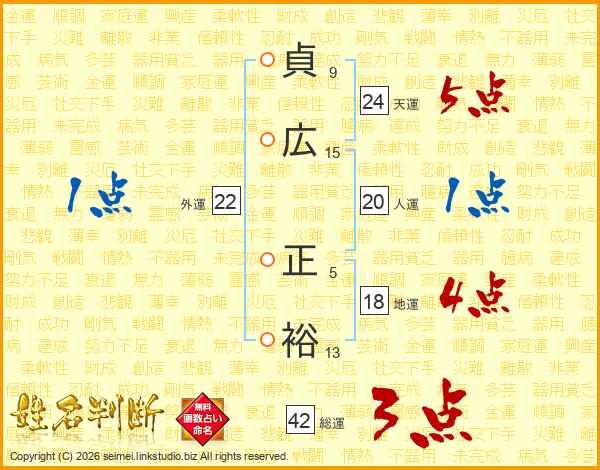 貞(9画)広(15画) 正(5画)裕(13画)