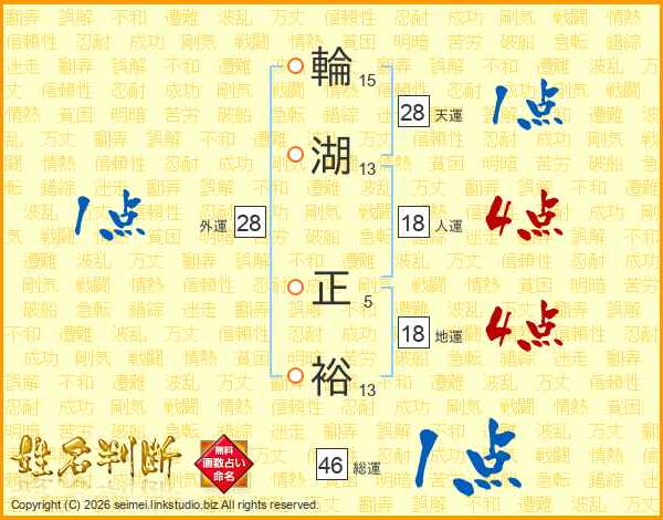 輪(15画)湖(13画) 正(5画)裕(13画)