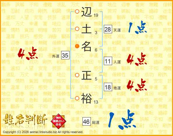辺(19画)土(3画)名(6画) 正(5画)裕(13画)