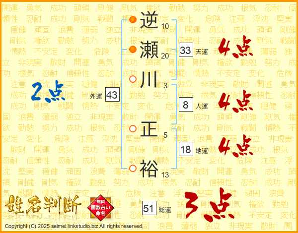 逆(10画)瀬(20画)川(3画) 正(5画)裕(13画)