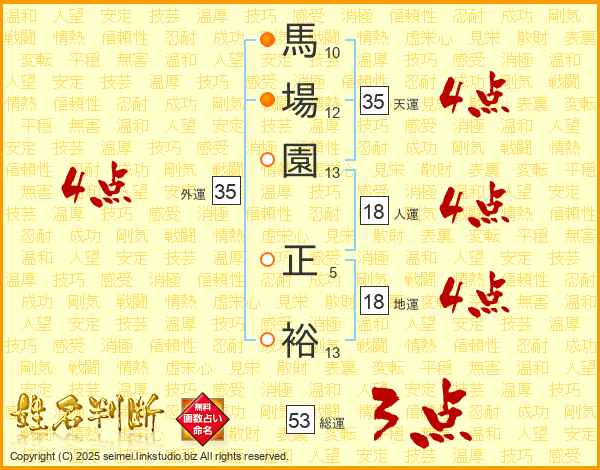 馬(10画)場(12画)園(13画) 正(5画)裕(13画)
