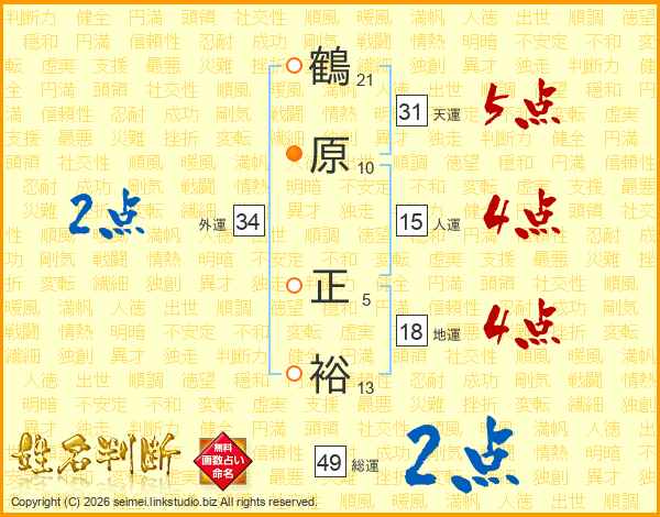 鶴(21画)原(10画) 正(5画)裕(13画)