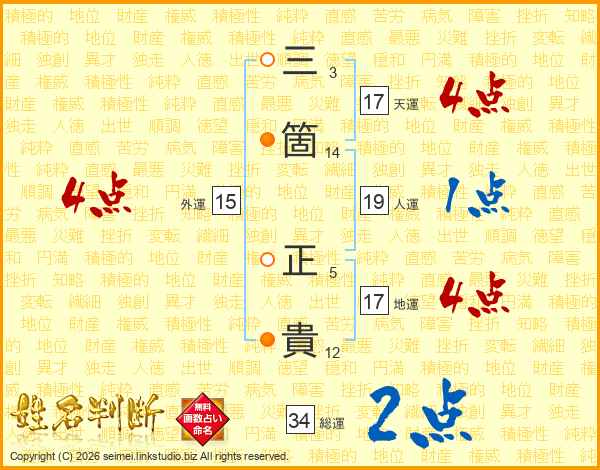 生活面を象徴する運勢です。外部から受ける影響力を表し、結婚運、家庭運や職場、環境への順応性を表します。総運から人運を引いた画数。姓や名が1文字の場合を除く。