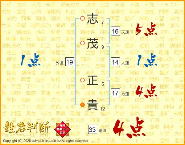 志(7画)茂(9画) 正(5画)貴(12画)