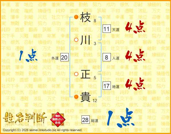 枝(8画)川(3画) 正(5画)貴(12画)