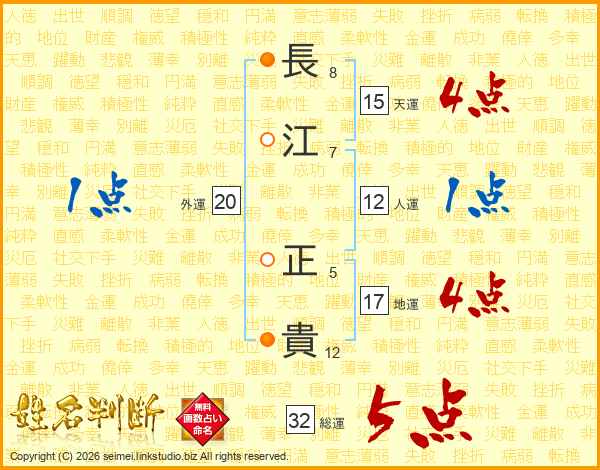長(8画)江(7画) 正(5画)貴(12画)