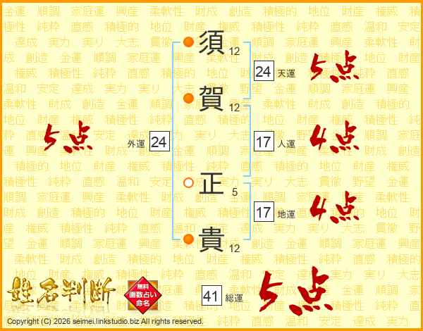 須(12画)賀(12画) 正(5画)貴(12画)