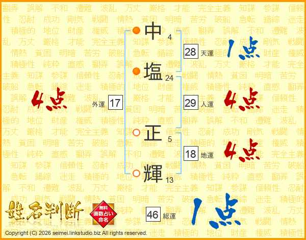 中(4画)塩(24画) 正(5画)輝(13画)