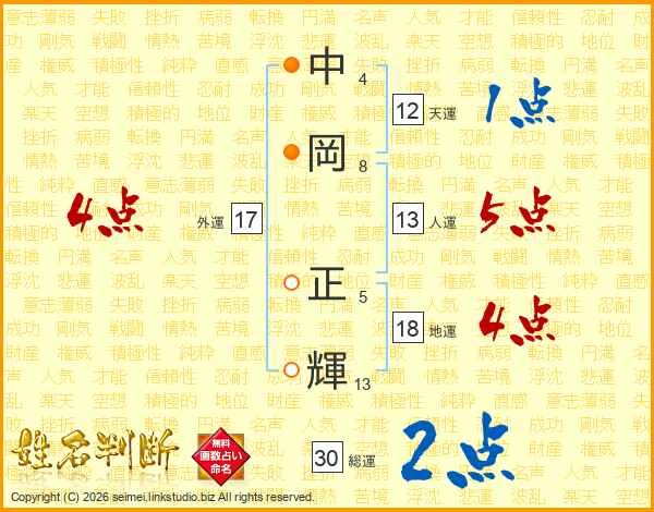 あなたの人生を表す1番重要な運勢です。生涯を通じて影響する総合運となり、主に50歳以降の晩年期に影響を及ぼします。苗字と名前の合計画数。