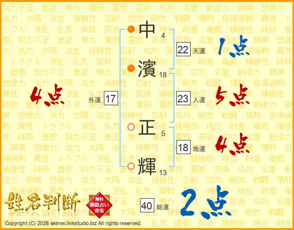 生活面を象徴する運勢です。外部から受ける影響力を表し、結婚運、家庭運や職場、環境への順応性を表します。総運から人運を引いた画数。姓や名が1文字の場合を除く。