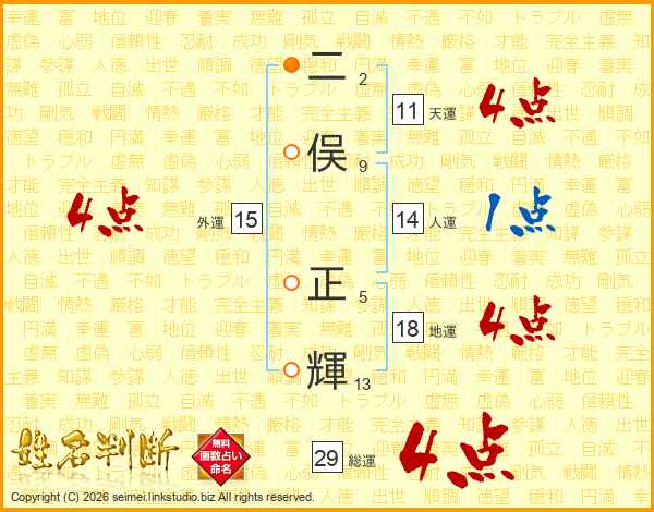 生活面を象徴する運勢です。外部から受ける影響力を表し、結婚運、家庭運や職場、環境への順応性を表します。総運から人運を引いた画数。姓や名が1文字の場合を除く。