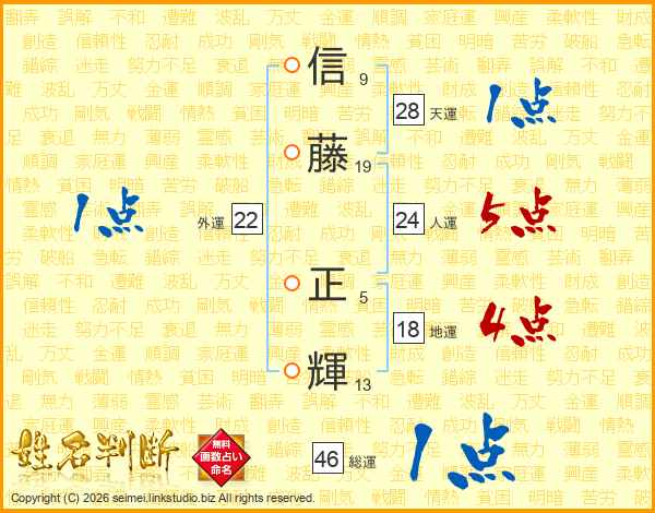 信(9画)藤(19画) 正(5画)輝(13画)