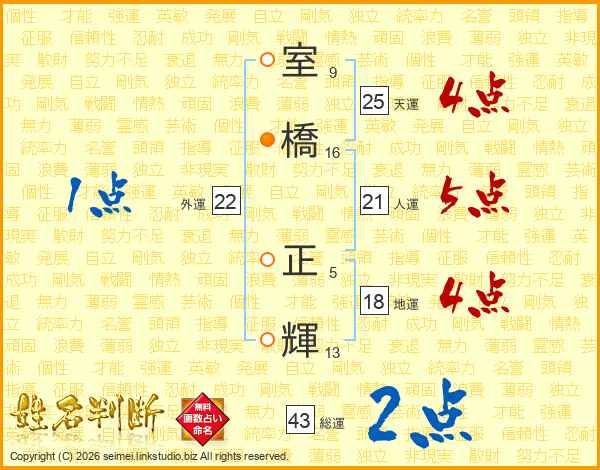 室(9画)橋(16画) 正(5画)輝(13画)