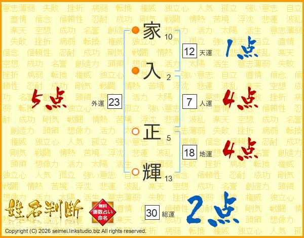 家(10画)入(2画) 正(5画)輝(13画)