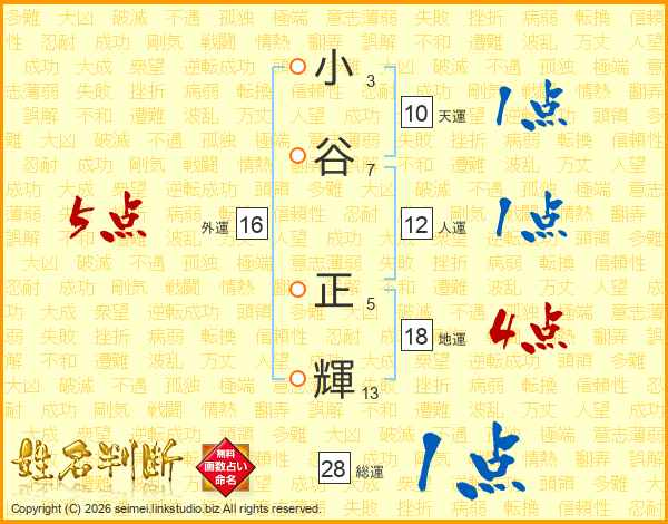 あなたの人生を表す1番重要な運勢です。生涯を通じて影響する総合運となり、主に50歳以降の晩年期に影響を及ぼします。苗字と名前の合計画数。