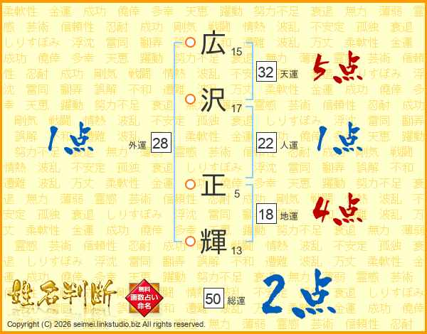 生活面を象徴する運勢です。外部から受ける影響力を表し、結婚運、家庭運や職場、環境への順応性を表します。総運から人運を引いた画数。姓や名が1文字の場合を除く。