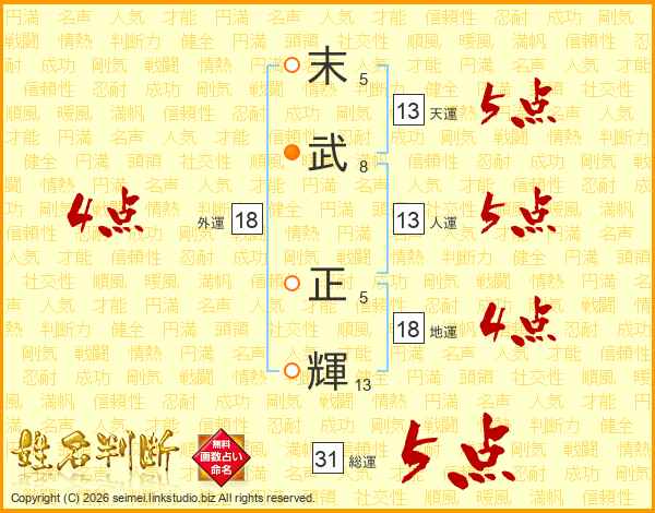 末(5画)武(8画) 正(5画)輝(13画)