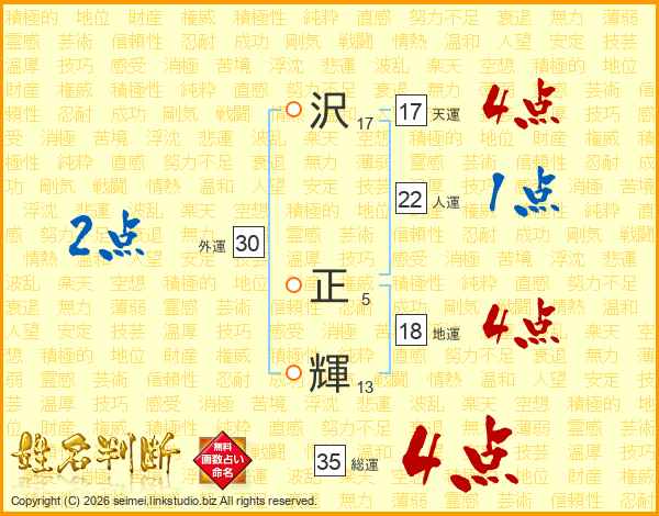 生活面を象徴する運勢です。外部から受ける影響力を表し、結婚運、家庭運や職場、環境への順応性を表します。総運から人運を引いた画数。姓や名が1文字の場合を除く。