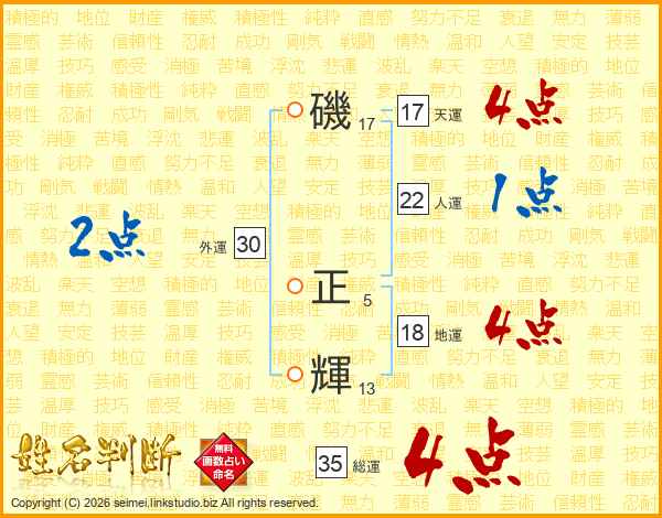 生活面を象徴する運勢です。外部から受ける影響力を表し、結婚運、家庭運や職場、環境への順応性を表します。総運から人運を引いた画数。姓や名が1文字の場合を除く。