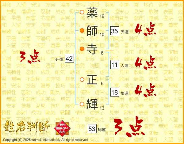 薬(19画)師(10画)寺(6画) 正(5画)輝(13画)