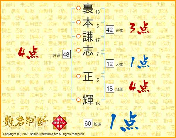裏(13画)本(5画)謙(17画)志(7画) 正(5画)輝(13画)