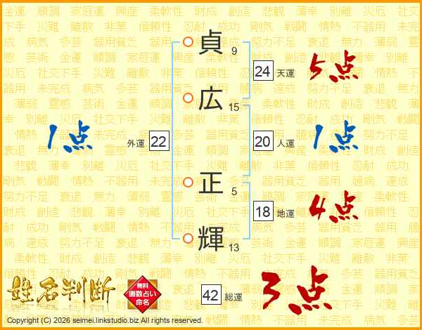 生活面を象徴する運勢です。外部から受ける影響力を表し、結婚運、家庭運や職場、環境への順応性を表します。総運から人運を引いた画数。姓や名が1文字の場合を除く。