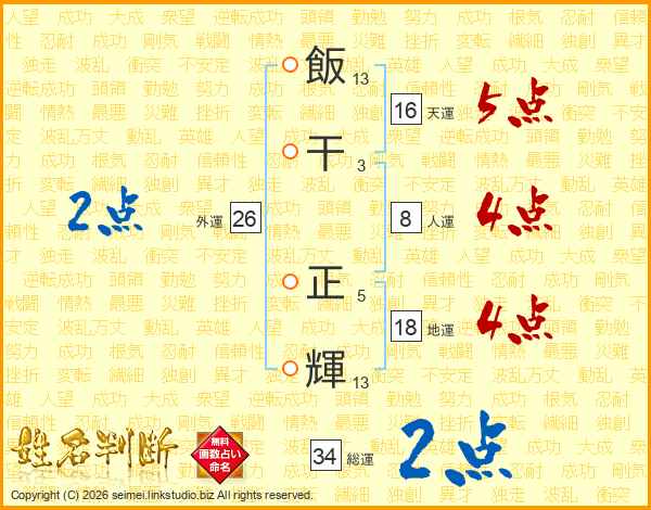 あなたの人生を表す1番重要な運勢です。生涯を通じて影響する総合運となり、主に50歳以降の晩年期に影響を及ぼします。苗字と名前の合計画数。