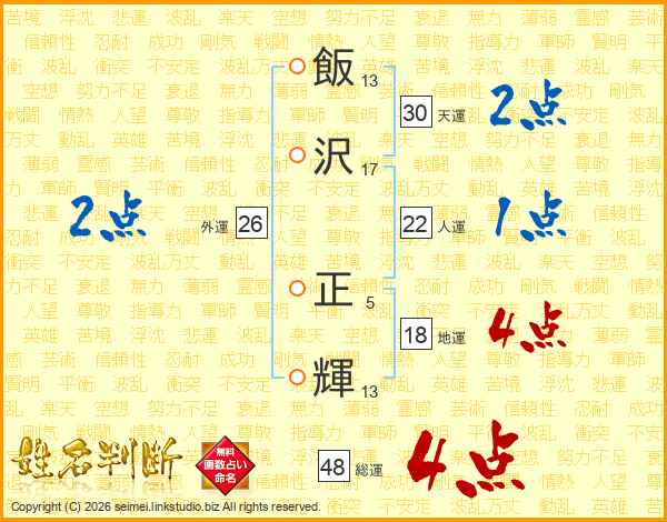 飯(13画)沢(17画) 正(5画)輝(13画)
