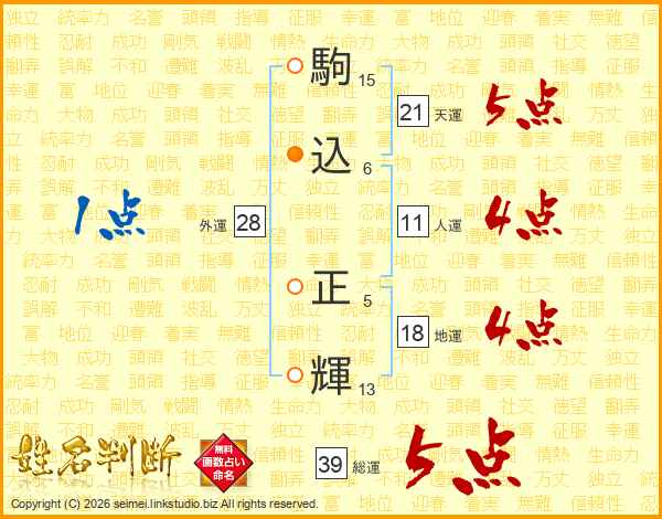 駒込正輝さんの総運は39画の5点!