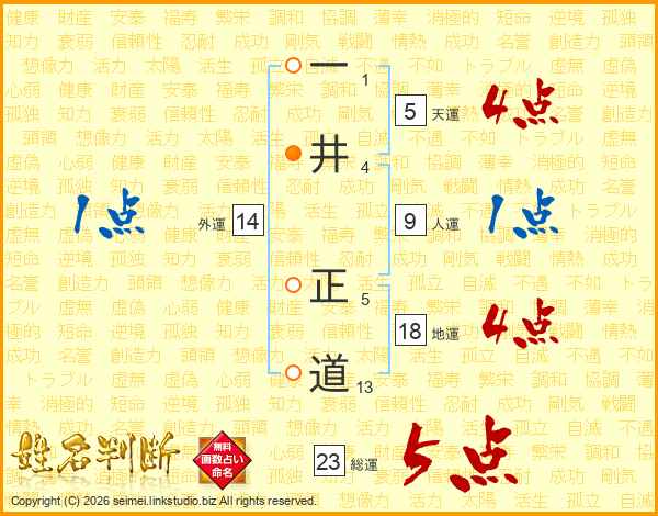 生活面を象徴する運勢です。外部から受ける影響力を表し、結婚運、家庭運や職場、環境への順応性を表します。総運から人運を引いた画数。姓や名が1文字の場合を除く。