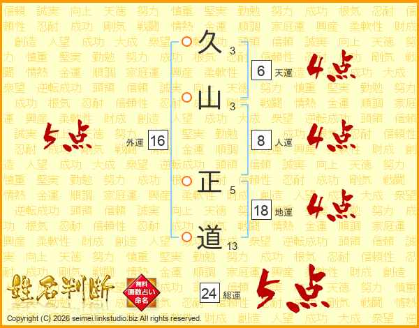 あなたの人生を表す1番重要な運勢です。生涯を通じて影響する総合運となり、主に50歳以降の晩年期に影響を及ぼします。苗字と名前の合計画数。