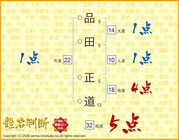生活面を象徴する運勢です。外部から受ける影響力を表し、結婚運、家庭運や職場、環境への順応性を表します。総運から人運を引いた画数。姓や名が1文字の場合を除く。