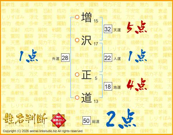 増(15画)沢(17画) 正(5画)道(13画)