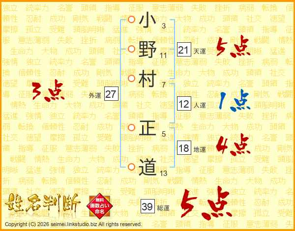 小(3画)野(11画)村(7画) 正(5画)道(13画)