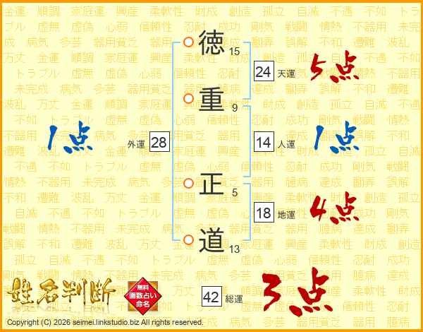 徳(15画)重(9画) 正(5画)道(13画)